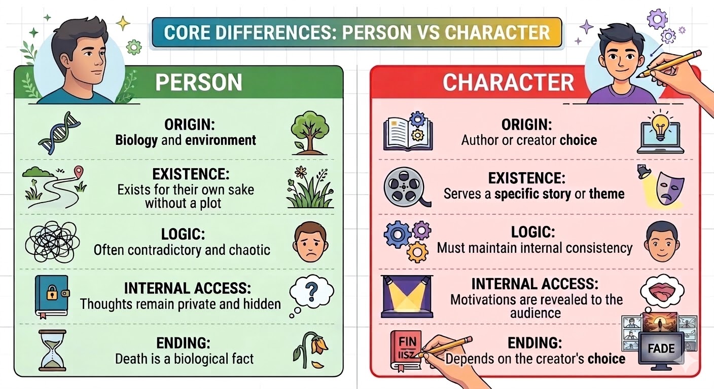 It is important to note that the term person refers to an individual human being in their natural state, and this should not be confused with a character portrayed in various forms of media such as plays, films, novels, or theatre. Although these characters may embody certain characteristics and traits unique to them, they are ultimately fictional constructs